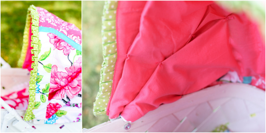 However, I still love the idea of having a vintage-y baby buggy. So I rounded up a dumpster-bound broken stroller, a basket we’d acquired on a recent trip to our local apple orchard, a table runner and placemat that haven’t made their way to my table in awhile, and went to work.