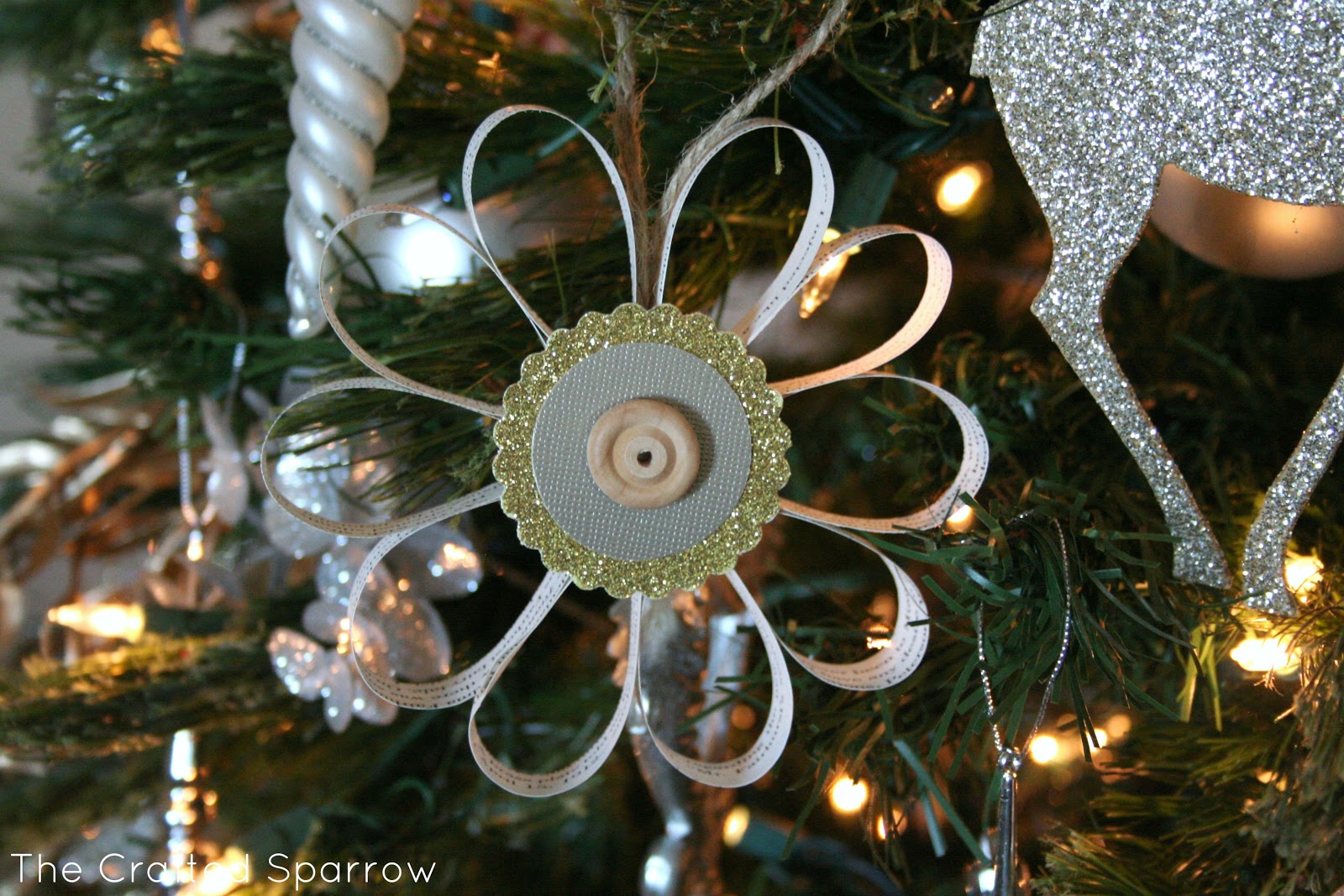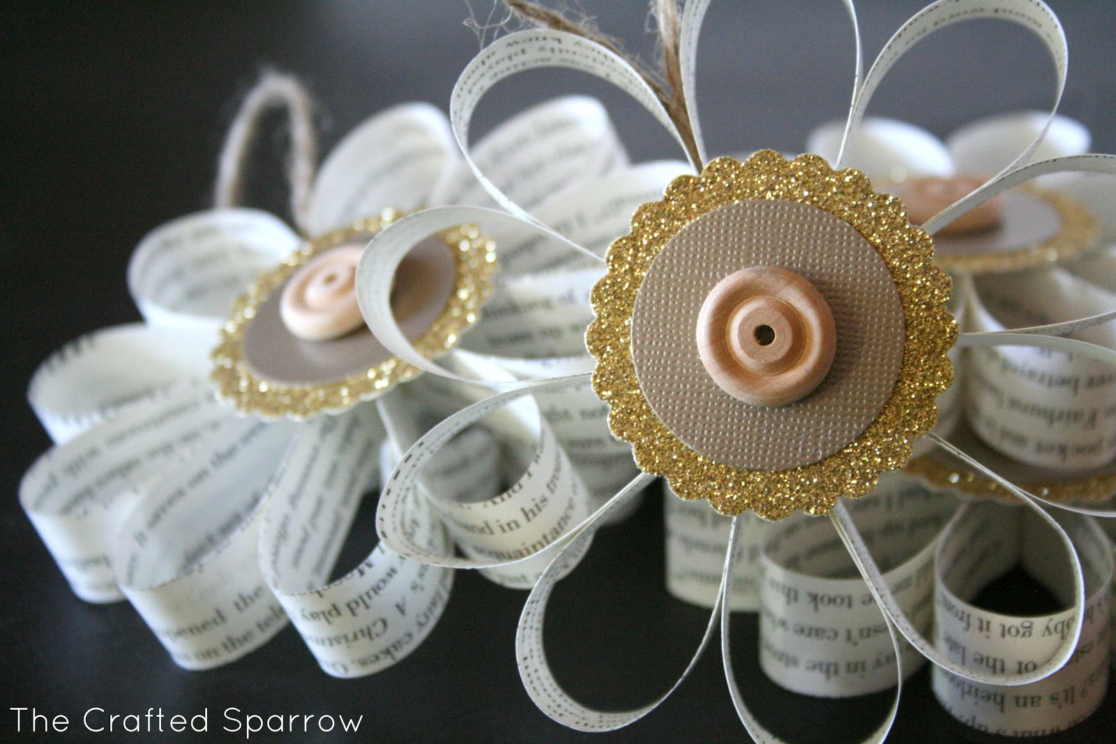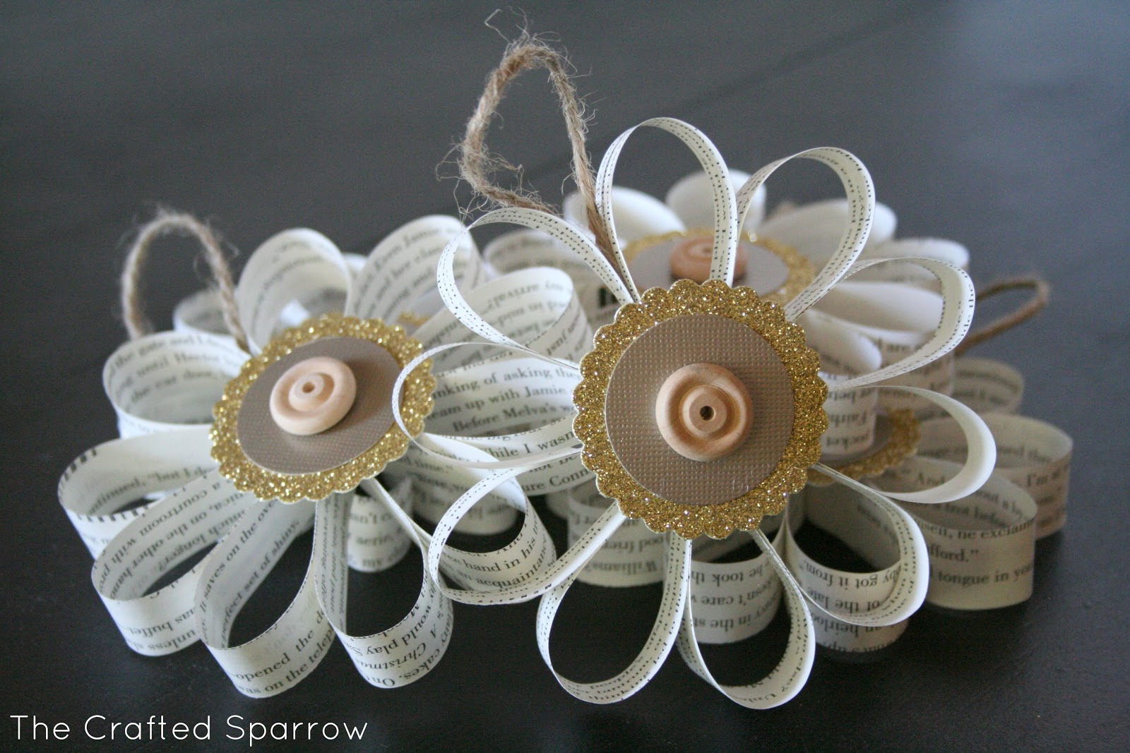 I then grabbed some twine from the Dollar Tree I had and created a hanger for each ornament and just hot glued it between two of the book page loops.