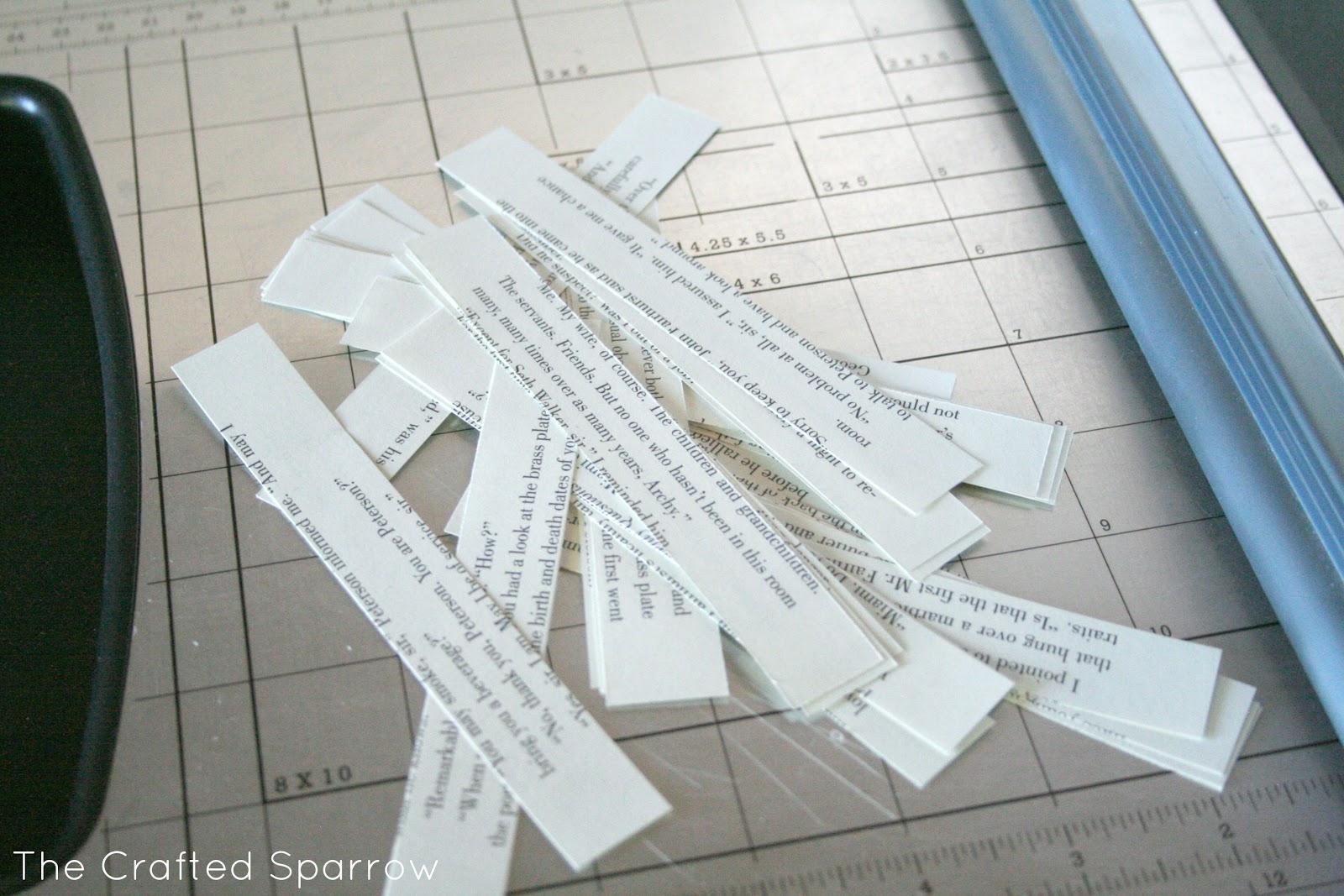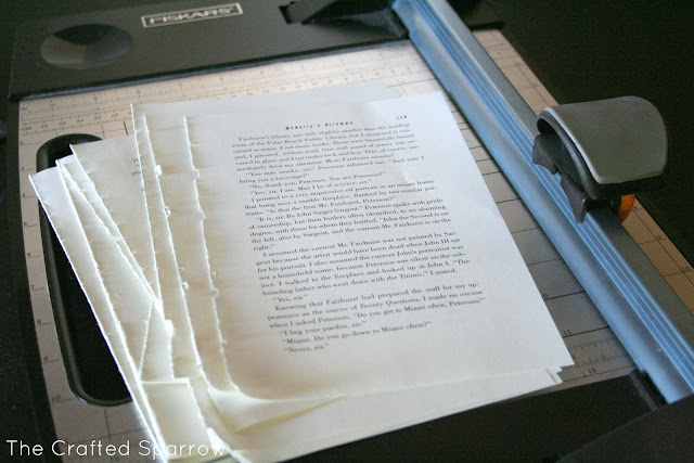 Then cut the book pages in strips either 1/2″ or 3/4″ wide. You want to cut them across the page, not lengthwise.