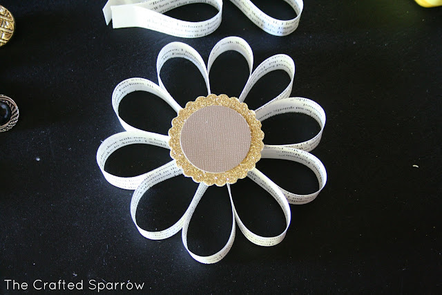 I then punched some cardstock using my 1.75″ & 2″ circle punches. I then hot glued them together and then to the center of my book page flower.