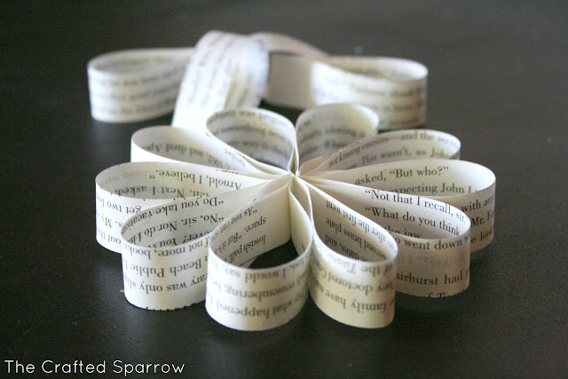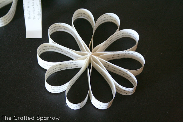Once you get a ton of book page strips cut you can either grab a stapler or a plain old fashioned glue stick {whatever you have on hand}. Start gluing or stapling your strips in to small loops. Try to glue or staple close to the ends, you should end up with small loops like this. I preferred the stapler method, much quicker.