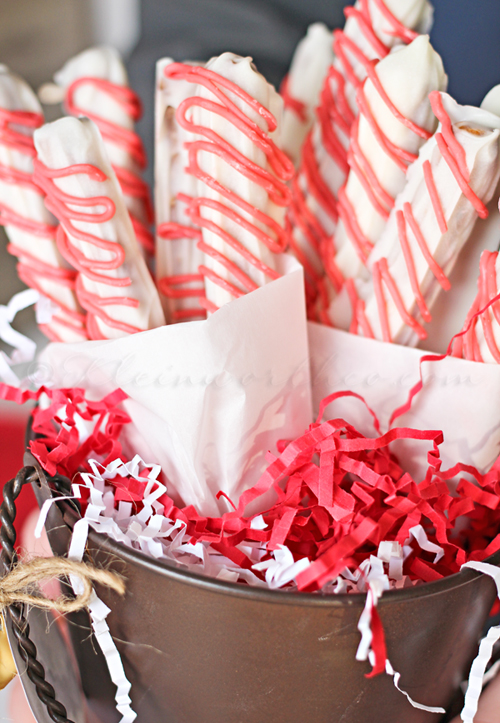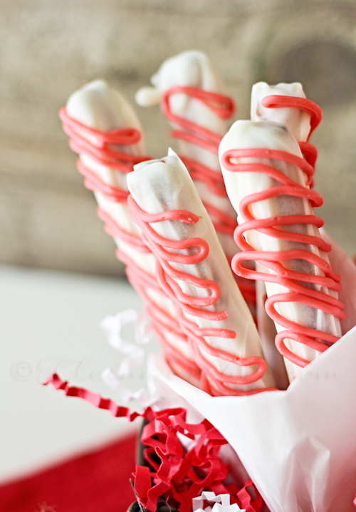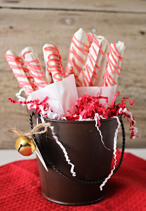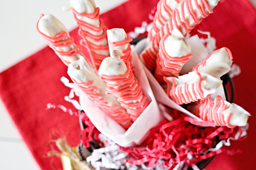 The next step is adding the pretzels. You can pop over to my blog to see how I made them and to print the recipe for the Candy Cane Pretzels.