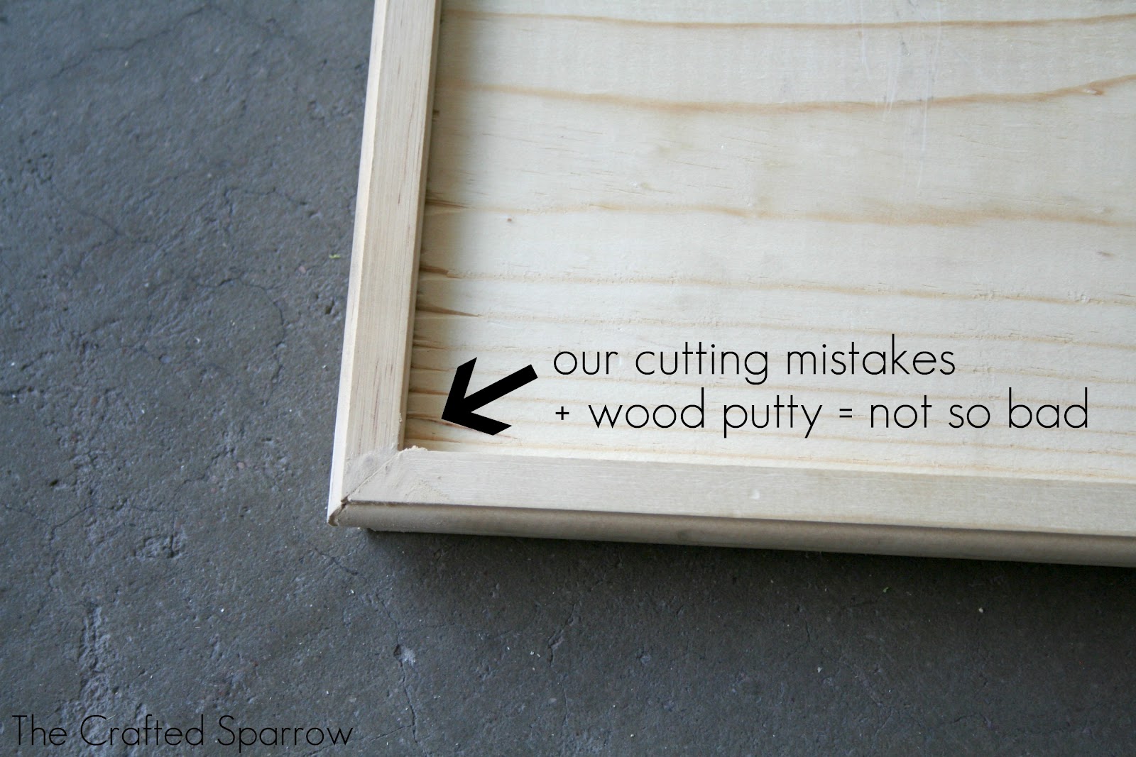 Once you get all your trim mitered, you will place a small bead of wood glue to the edge of your pine board. Then using finishing nails, you will nail the trim to the two end pieces and front. Make sure to using the finishing nail tool to ensure your nails get flush with the trim. You can use wood putty to fill in the holes and sand lightly.