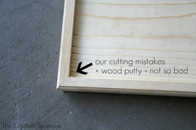 You can see the video we watched HERE. I’ll be honest this was the worst part of making these shelves. We were so frustrated trying to figure out how to miter the corners since neither one of us had ever done it before. My suggestion is to have the guys at Home Depot show you when your in the store. The only cut we actually made right was the very last corner of the last shelf, the rest were all funky. All I can say is thank goodness for wood putty!