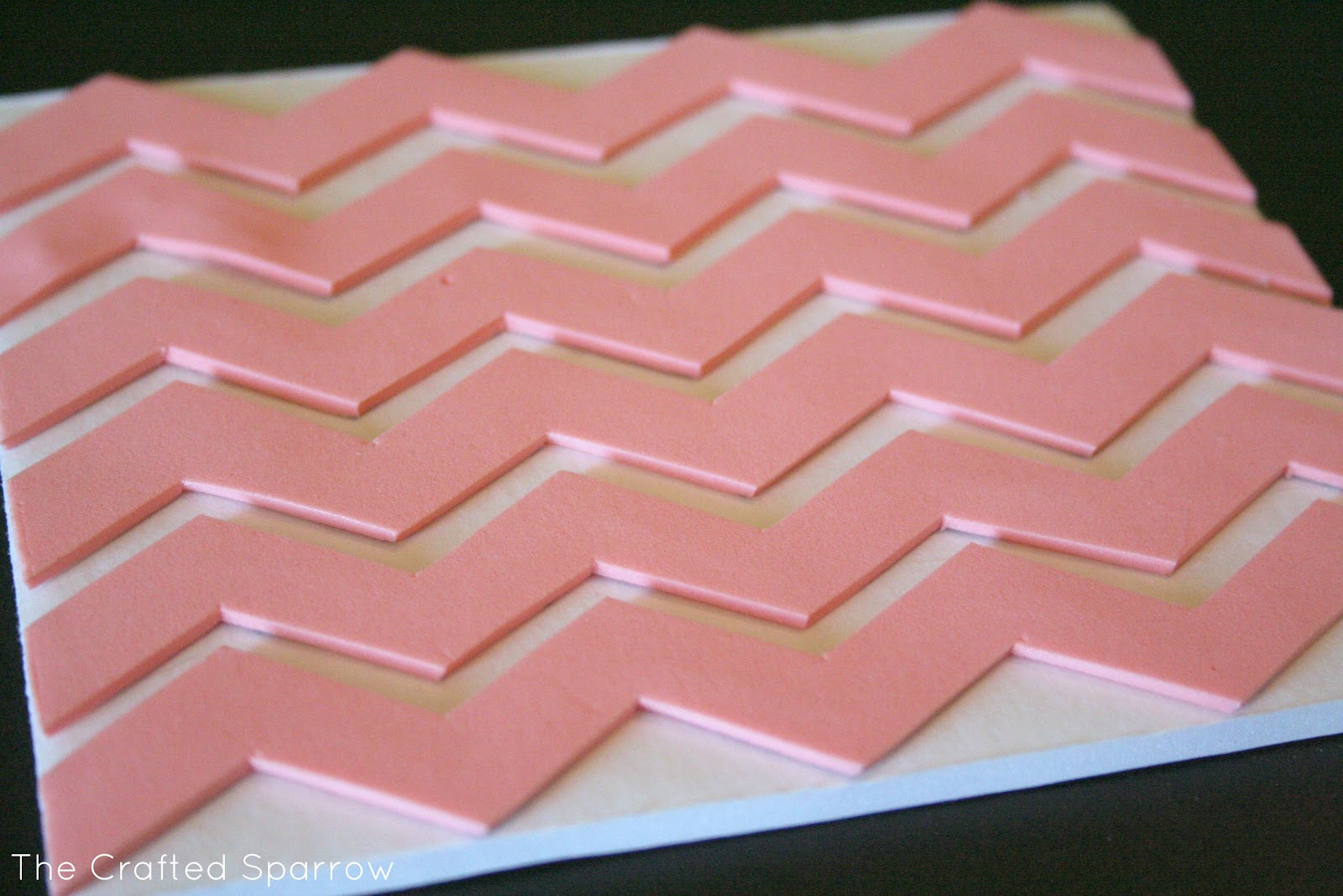 I then cut it all out with my scissors. There is something about cutting craft foam to me that is therapeutic, it just cuts so smooth. When your done cutting you’ll have a ton of chevron stripes like this.