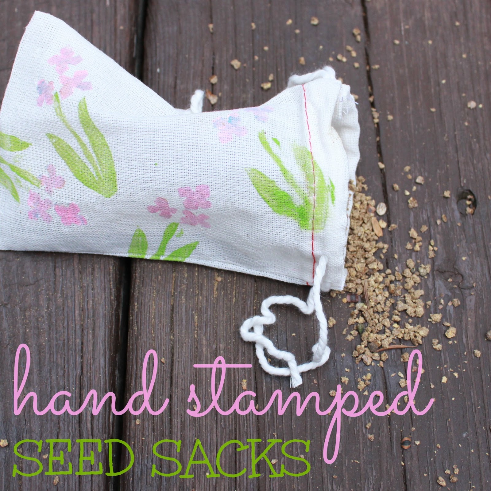 To make your own set of hand stamped seed sacks you only need a few supplies: a foam sheet, wood blocks, linen bags, double-sided tape, paint/ink pads, and scissors.