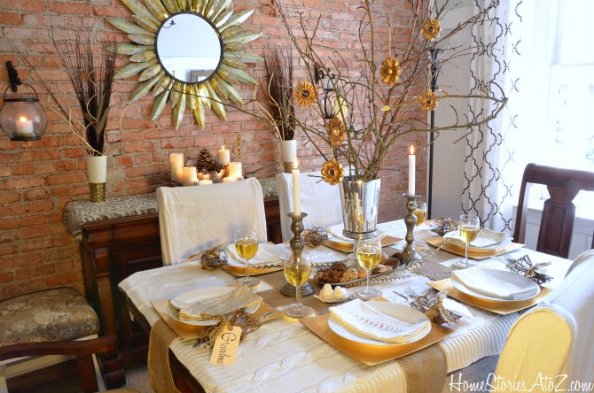 thanksgiving tablescape ideasHome Stories A to Z created this elegant gold tablescape complete with feather-print cloth napkins.  The cable-knit throw-turned-tablecloth adds an unexpected touch that makes this table unforgettable.