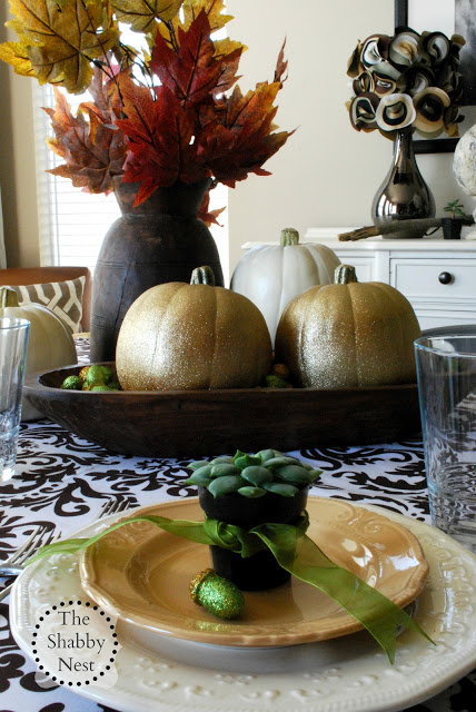 The Shabby Nest offers an unexpected twist on a Fall Holiday Table by adding succulents to her tablescape.