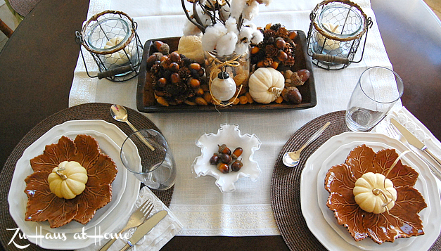 Zuhaus at Home created a simply elegant Thanksgiving table for two.   Pretty white pumpkins and acorns add the perfect pop of texture.